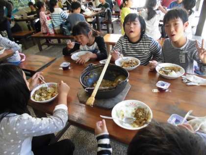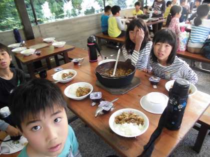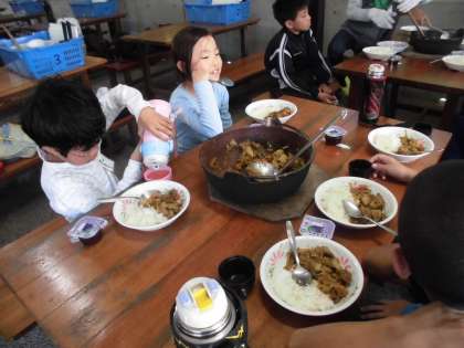 苦労して作ったカレーをおいしそうにほお張る子どもたち。
