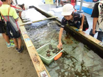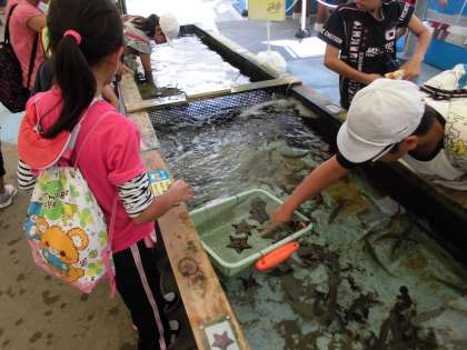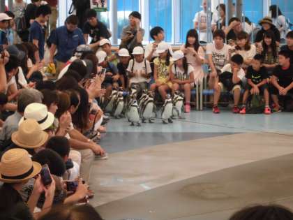 アシカショーやセイウチのショー,ペンギンの散歩や魚を触れるコーナーなど,いろいろ楽しむ子どもたちです。