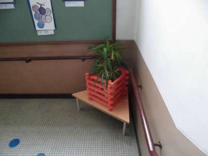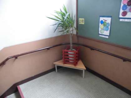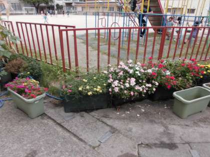 正門前の花々や階段の観葉植物がきれいに置かれています。子どもたちがほっとできる居心地のよい学校を目指して,これからも取組を続けます。