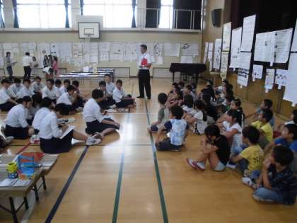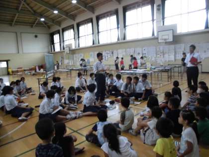 さて,2日目も七条中の2年生が見学に見てくれましたが,今日は小学生に感想を伝えたり,質問に答えたりする時間を設けました。どちらも緊張していたようでしたが,コミュニケーションをとることができました。