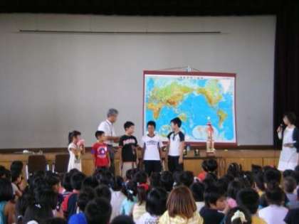 夏休み前の全校集会で,七三統一漢字テストの表彰式を行いました。(写真上)