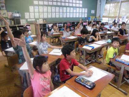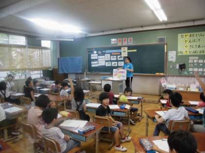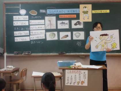先週は1年の教室で食の学習を行いましたが,今日は2年生の教室で行いました。