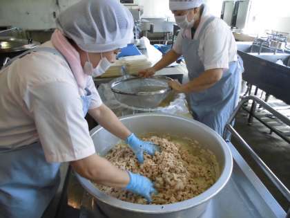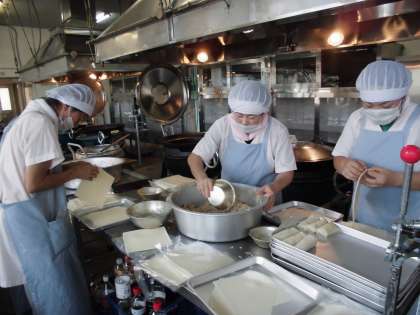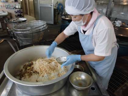 3人の給食調理員さんたちが協力しながら,手際よく調理を進めていきます。