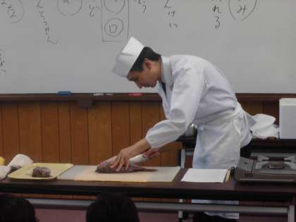 「和食とは」「味はどうやって感じるのか」「盛り付け方による違い」などについて,実際に魚をさばき,丁寧に盛り付けていく様子を示しながらお話していただきました。