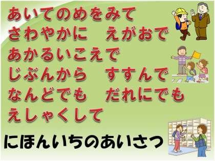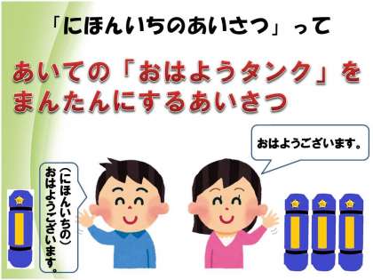 「相手の目を見て」「さわやかに笑顔で」「明るい声で」「自分から進んで」「何度でも誰にでも」「会釈して」あいさつし,相手の「おはようタンク」を満タンにするのか「日本一のあいさつ」です。