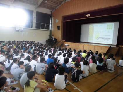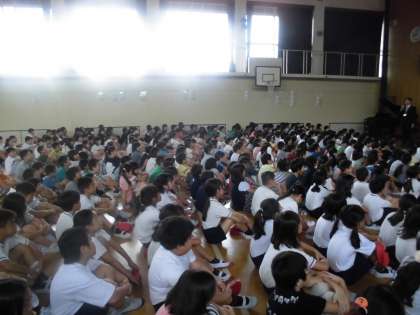 校長先生は,まず「あいさつ」についてお話されました。前期終業式でのあいさつの話を受けて,あいさつに変化が見られました。会釈する子が増えたようです。このまま,「相手のあいさつタンクを満タンにするあいさつ」を続け,「七三タンクローリー」も満タンにしてほしいものです。