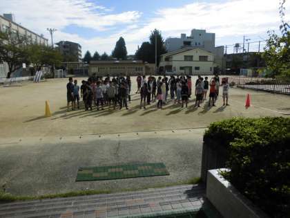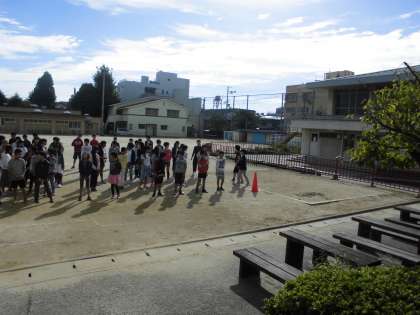 朝,運動場から楽しそうな声が聞こえてきたので外に出てみると,6年生が全員で集合写真を撮っていました。