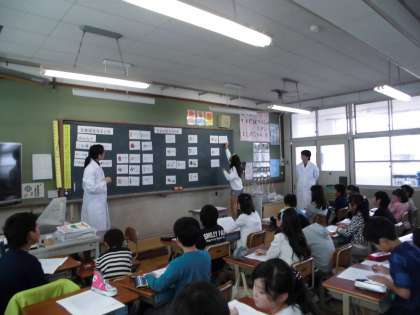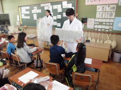 今週の4年生の878学習では,京都環境保全公社の方にお越しいただき,ごみについて学習しました。牛乳パックや空き缶,食べ残しなど,ごみが何に生まれ変わるのかを予想し,みんなで考えていきました。また,実際にごみから生まれ変わった燃料やプラスチック製品を見せていただきました。ごみがいろいろなものに生まれ変わったり,リユースされたりしていることを,楽しく学習することができました。