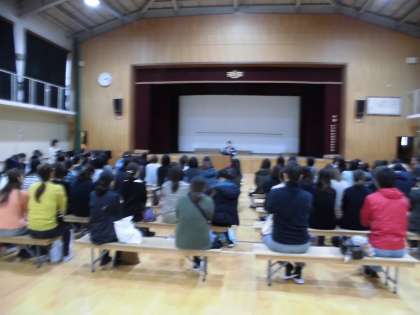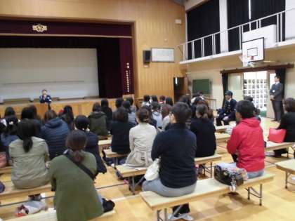 子どもたちが検診に行っている間,体育館では保護者の方に向けて.警察の方と児童館の館長さんからお話がありました。