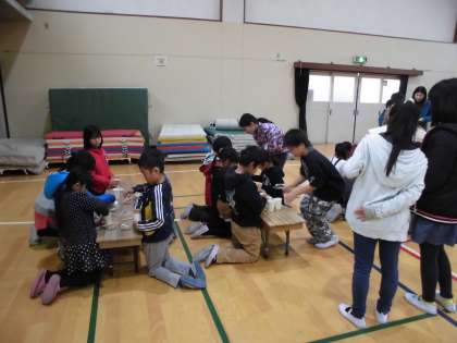 体育館やまなび教室に作られたコーナーを,たてわりグループで回って活動します。