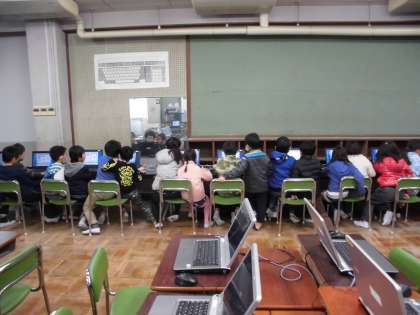 朝から元気にコンピュータ室にやってきた子どもたち。低学年と高学年でペアを作って作業を進めたので,高学年の子は積極的に低学年の子に教えていました。教え合いながら上手に作業ができたので,限られた台数のパソコンでも,スムーズに作業ができ,素敵なカレンダーを完成させることができました。