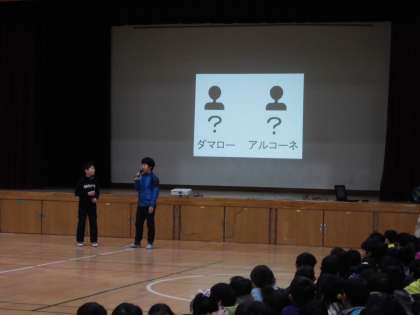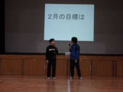今日は児童朝会です。児童会長の言葉に続き,児童会から2つの提案がありました。