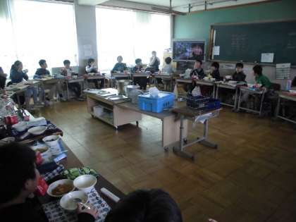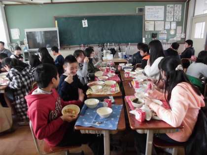 写真は,今年度最後の給食の様子です。「ぷりぷり中華いため」をおいしそうに頬張っています。
