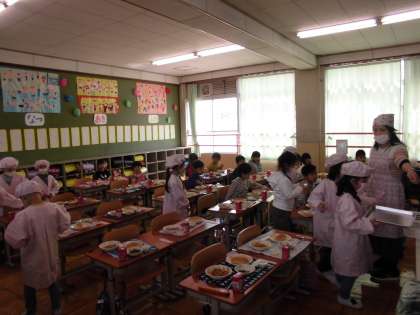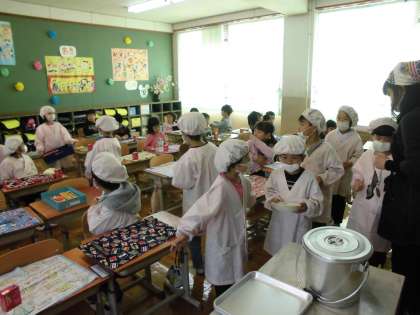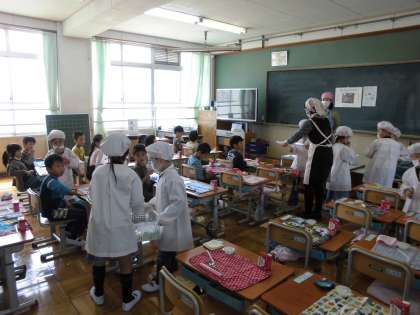 食器や食缶,パンや牛乳を重そうに教室に持って来ると,配膳が始まります。