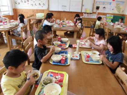 1年生では,初めてランチルームで給食を食べました。栄養教諭からご飯の食べ方やランチルームの使い方などを教えてもらいました。いつもと違う給食の時間だったので,わくわくしながら食べていました。次のランチルームでの給食が楽しみです。