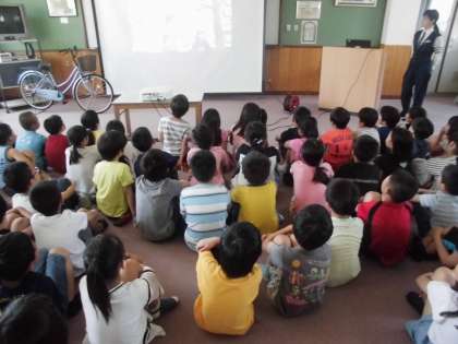 今日は3校時,3年生で交通安全教室を行いました。歩道の歩き方や自転車の乗り方を中心に,下京署の警官の方にお話していただきました。