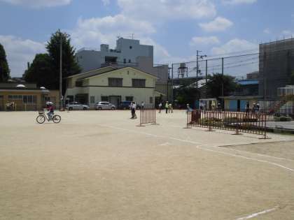 運動場では実技試験です。警察の方にポイントを教わり,地域・PTAの方々が採点をしてくださいます。