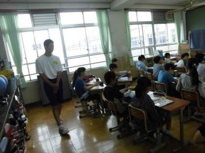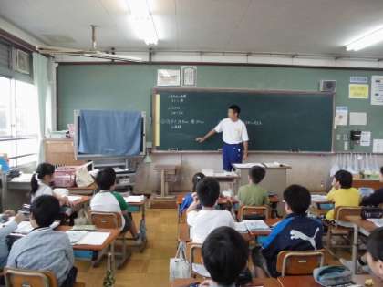 教壇に立ち,子どもたちに説明や解説をします。