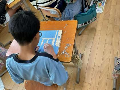 図画工作科の学習で、版画に取り組んでいます。今年度のテーマは、小学校生活6年間での思い出です。6年間の小学校生活の中で印象に残っていることを選び、下絵を描き、彫り進めています。修学旅行の部屋からの眺め、毎日過ごした教室の風景など、思い思いに作品つくりに励んでいます。