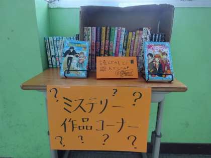 読書週間が始まり、廊下にはミステリーの本が手に取れるように関連する読書のコーナーも作りました。登場人物の行動や気持ちの変化を想像しながら進んで本を読み深めてほしいと考えました。