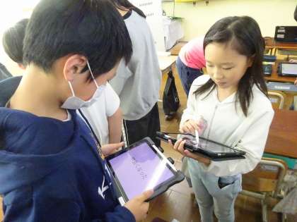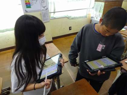 交流の時間には、タブレット端末を使って、友だちの考えをメモしながら、「どうして」「だって」「でも」「なるほど」など、反応や問い返しなど、相手意識をもって考えを広げたり深めたりすることができました。
