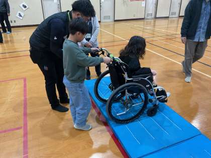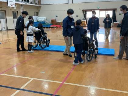 11月12日(水)の2時間目は、特別養護老人ホーム京・みやこの方にご協力いただき、施設の様子をリモートで見学しました。エレベーターの広さや部屋によって机の配置が違っていたりするなど、高齢者の方が安心して過ごせるようにたくさんの工夫があることに気付きました。3時間目には、特別養護老人ホーム京・みやこ、特別養護老人ホーム西七条、島原包括センターの皆様にご来校いただき、車いす体験をしました。子どもたちは「乗っている人が安心できるようにするにはどうすればいいか」を考えながら、声をかけたり、ゆっくり押したりしていました。地域の皆様のおかげで、思いやりの心を育む貴重な体験ができました。ありがとうございました。