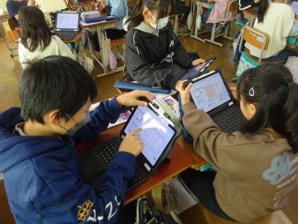 音楽「日本の音楽でつながろう」では、先日体験したことの学習を活かして、「さくらさくら」の音階でグループごとに旋律づくりをしました。