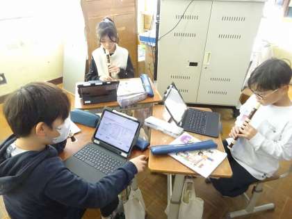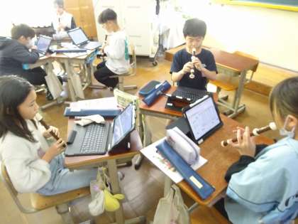 音楽のまとまりを考えて、グループごとに8小節の楽譜を創って、リコーダーで演奏し合いました。つなぐ順序や繰り返しの仕組みを取り入れながら、オリジナルの旋律を創り上げることができました。