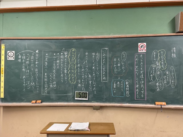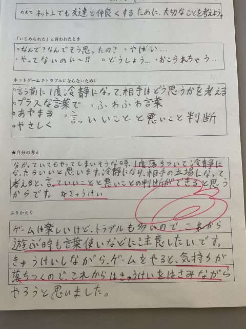 5年生は、オンラインゲームでの出来事を題材に、SNSのトラブルを防ぐための言葉の使い方について考えました。「正しい行いは分かっているけれど、できない時がある」という意見が出され、その原因や対策についても、みんなで話し合うことができました。