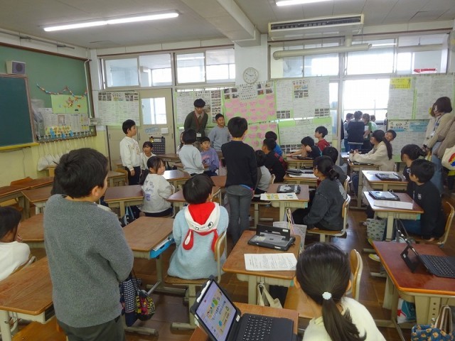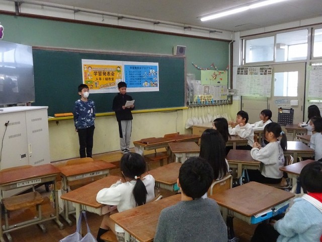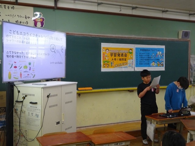 4年生はハナヤ学習「七三から世界へ!広がれエコの輪」で学習したことを保護者の方や3年生に発表しました。