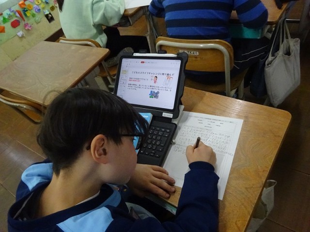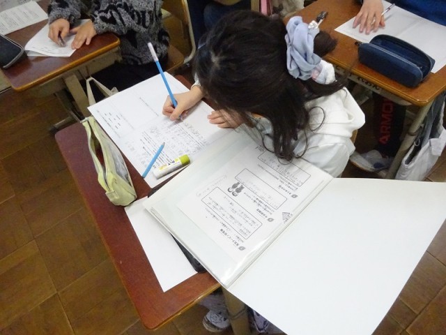 学習発表会後には、振り返りをしました。1年間の学習を見返しながら、エコに対する自分の思いや考えを書きまとめることができました。