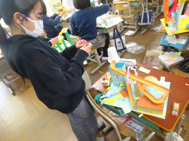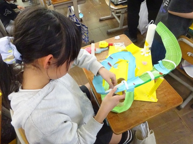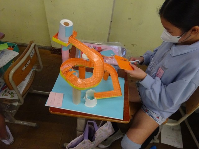 図工「コロコロガーレ」の学習では、ビー玉を楽しく転がるように試しながら、コースづくりを進めています。自分の考えた設計図をもとに、形や色、材料などを生かしながら、どのように表すのかを考えて作品を作っています。完成した作品は来週の図工展に展示予定です。一人一人がどのような工夫をして作品を作ったのか、ぜひご覧ください。