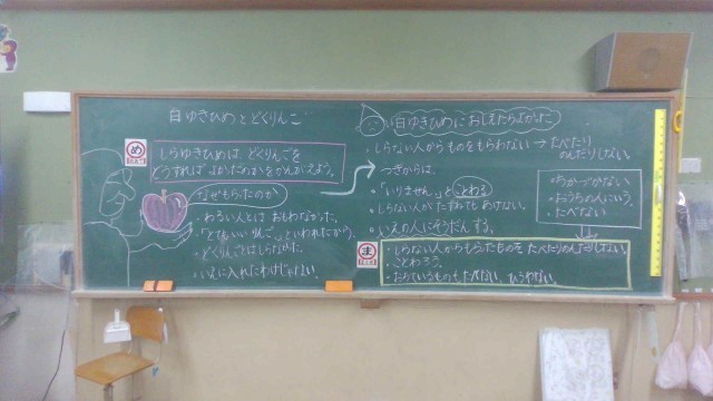こころの日の学習で、「しらゆきひめとどくりんご」というテーマの学習をしました。毒リンゴをもらった、白雪姫はどうしておけばよかったのかと考えることを通して、「知らない人から食べ物を受け取らない、食べない。」など、自分の身を守ることについて考えました。またご家庭でも、話題に挙げていただければと思います。