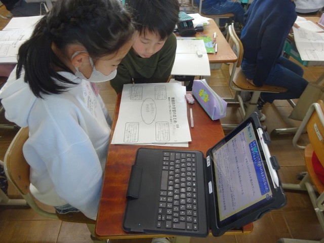 社会「ゆたかな自然を生かす宮津市」の学習では、学習問題についての調べ学習をしたり、二択の問いに対して自分の考えをもち、友だちと交流することで考えを広げたりまとめたりして、対話の機会を大切にして学習を進めてきました。