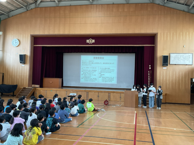 それぞれの委員会の代表者が、5年生と教職員にむけて委員会を設立する目的や理由、行いたい活動内容、5年生へのメッセージを紹介しました。