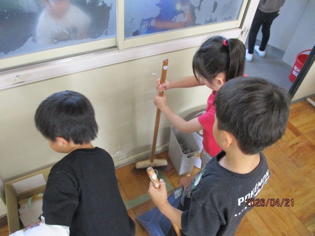 6年生のお話をよく聞いて、真似をしながら一生懸命に掃除しています!