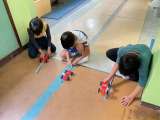 ゴムでうごくくるまを はしらせました。 ゴムをながくのばすほど とおくにはしる...