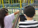 直線、カーブ、十字といった線路カードを使って、ぐるっと回れる線路づくりに取り組み...