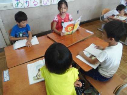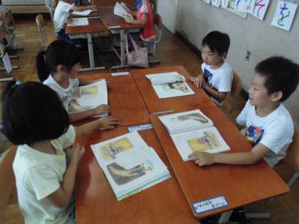 『おむすび ころりん』のお話は,リズムよく読めるので1年生の子どもたちは大好きです。「おむすび ころりん すっとんとん。ころころ ころりん すっとんとん。」と元気な声が教室に響き渡ります。この楽しいお話の音読発表会をするために,グループで読みたい場面を決め,役割りを決めました。話し合っているうちに読みたくなってきました。自然に練習が始まりました。