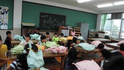 くしゃくしゃにした紙をふくらませたり,ねじったり,しばったりしながら,お気に入りの「友だち」をつくります。