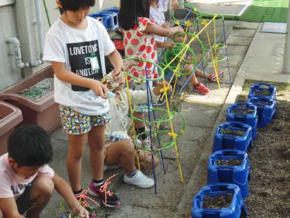 春からあさがおを育ててきました。夏には緑の葉が出て,きれいな花がたくさん咲きました。秋が近づき,葉やつるも枯れていき,種がたくさんとれました。毎日水やりをし,大切に育ててきたあさがおです。そんな大事なあさがおをの片づけをみんなでしました。枯れていてもつるは支柱にしっかり巻き付いていて,取るのにとても苦労しました。鉢に入っている土を花壇に返しました。空っぽになった鉢が並んでいる様子はどことなく寂しげです。とったつるは輪にして乾かし,飾り作りをします。