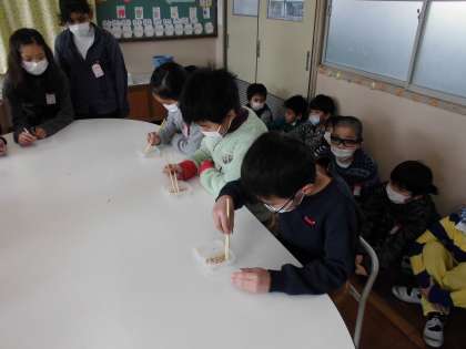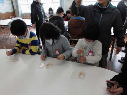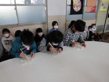 生活委員会の児童が計画して開いてくれた豆つまみ大会に参加しました。30秒間に,お箸を使ってどれだけの多くの豆を移動することができるかにチャレンジしました。3年生は楽しんで参加していました。