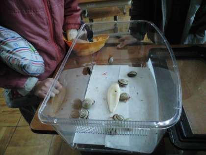 しばらく生き物のいなかった教室に,かたつむりがやってきました。