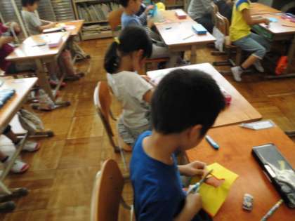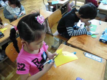 図画工作科の学習で,はさみの使い方を学んでいるところです。指をしっかり入れて開いたり閉じたりする時に,口では「ひらいて,ちょき」,「ひらいて,ちょき」と言いながら切る練習です。