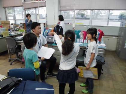 2年生では,生活科の学習で学校探検をしています。1年生に九条弘道小学校のヒミツを教えるために,学校のことを改めて自分で調べたり,先生にインタビューしたりしています。今回は職員室に行きました。