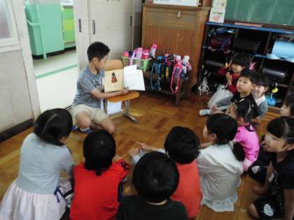 水曜日の「パワーアップスタディ」には,図書委員の子どもたちが読み聞かせに来てくれています。教室の前と後ろに分かれ,図書委員の近くに集まって,絵本の読み聞かせを聞いています。図書委員の子どもたちは,毎週絵本を選んで読む練習までしてくれています。読み聞かせが好きな1年生はお話の中に入るように話を聞いています。
