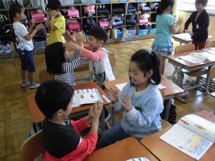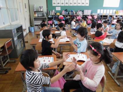 音楽の時間に,2拍子のリズムに合わせて手拍子を打ちながら歌いました。子どもたちは思い思いのリズムのとり方を表現していました。初めは1人で,途中からはペアで学習をして楽しみました。