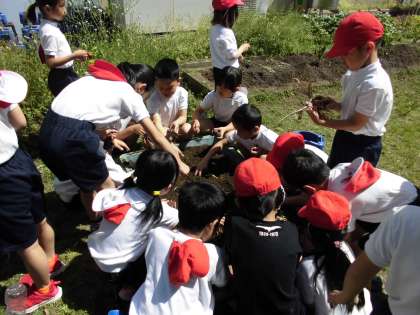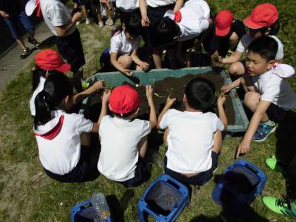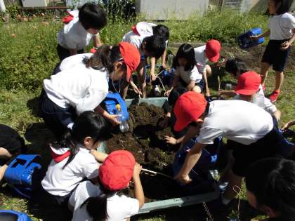 生活科の学習では,植物を植木鉢に植えるための準備を始めました。まず,1年生の時に使っていた土を1か所に集めて,雑草などをとりました。これから,肥料などを混ぜて準備を進めます。