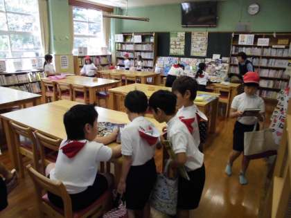 図書の時間には,自分の読みたい本を借りて読んでます。学校図書館では,一度に2冊まで本を借りることができます。子どもたちは朝読書の時間などに読みたい本を選び,絵本バッグに入れて教室に置いています。