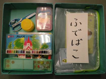 お道具箱の中身は,「パス,クーピー,はさみ,のり,数図ブロック,計算カード」です。すぐに用意できる場合は,セロハンテープをもって来てください。